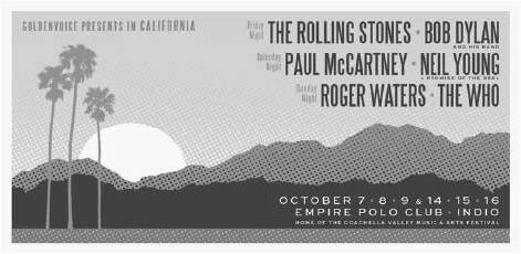 ক্যালিফোর্নিয়ার ইন্ডিঙতে গত মাসের ডেজার্ট ট্রিপ ফেস্টিভ্যালে সিক্সটিচ্ছের ছয়জন রক লিজেন্ড বব ডিলান, দ্য রোলিং স্টোন্স, নেইল ইয়ং, পল ম্যাকার্টনি, দ্য হু আর রজার ওয়াটার্সরে এক জায়গায় করা হয়েসিলো। দুই দিনের এই উইকেন্ড শো’তে কমসেকম দেড় লাখ টিকেট বেচা হইসে।